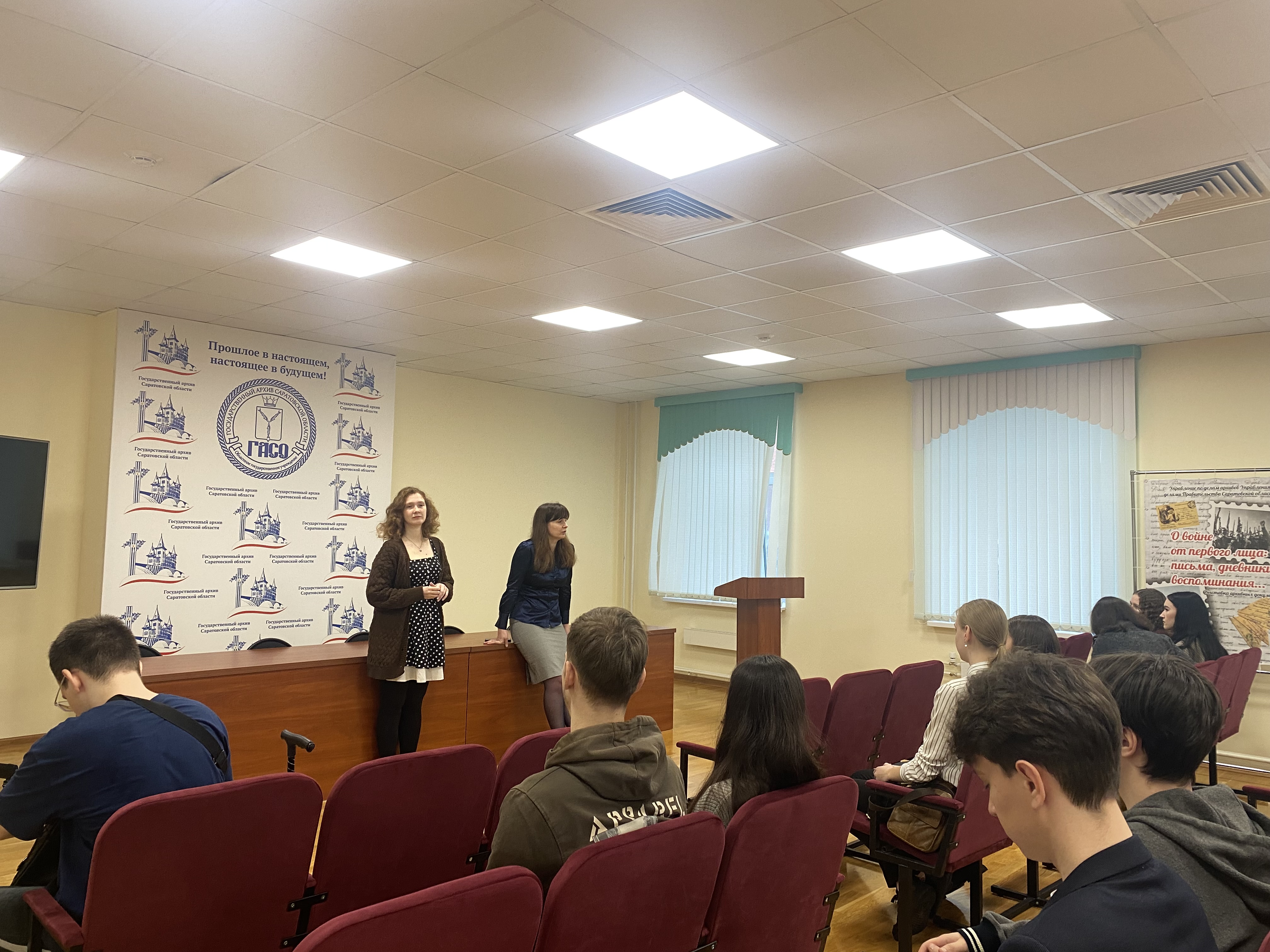 В ОГУ ГАСО проведено мероприятие по профессиональной ориентации для студентов 3 и 4 курса социально-экономического института СГТУ им. Гагарина Ю.А. (направление «Документоведение и архивоведение»). Данное событие направлено на формирование у студентов, являющихся своего рода кадровым резервом для государственных и муниципальных архивов региона, представлений об основных направлениях деятельности учреждения, особенностях профессии архивиста, а также основных знаний и навыков, необходимых для самореализации в этой отрасли.
