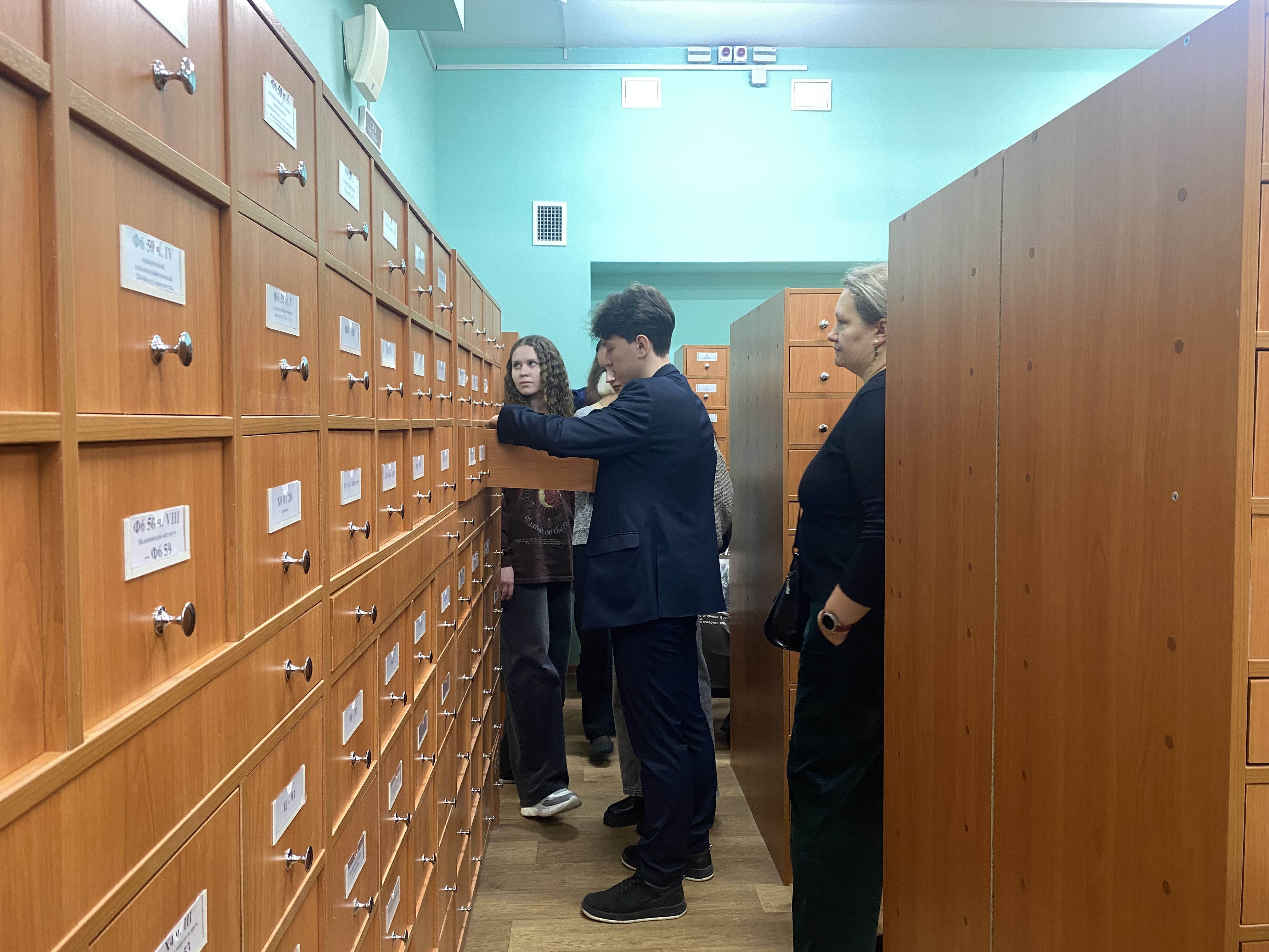 Начальник отдела научно-справочного аппарата М.Ю. Болдырева ознакомила студентов-участников мероприятия с принципами функционирования системы поиска ретроспективной информации на примере работы с систематическим каталогом и фотокаталогом как основным элементом системы научно-справочного аппарата архива.