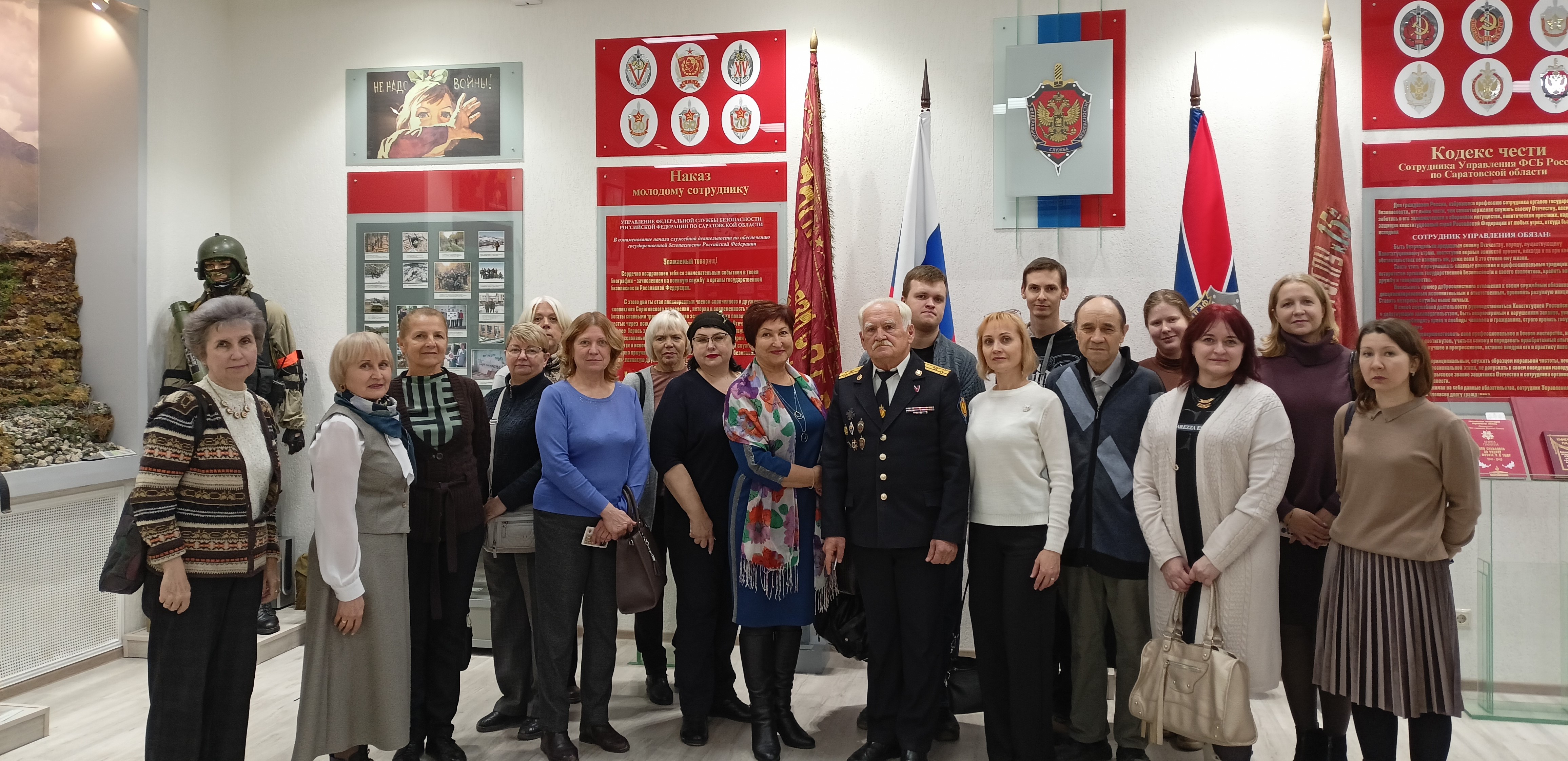 В этом году появилась возможность посетить зал истории Управления ФСБ по Саратовской области. 28 ноября на улице Дзержинского сотрудников ГАСО встретил Александр Семёнович Нечаев, ветеран органов безопасности, главный хранитель исторического наследия УФСБ. Он ознакомил гостей из архива с вехами истории органов безопасности, начиная с февраля 1918 года, когда в Саратовской губернии был образован отдел по борьбе с контрреволюций и саботажем. Экспонаты и фотографии, представленные на стендах, вызвали живой интерес и обсуждение среди сотрудников ГАСО.