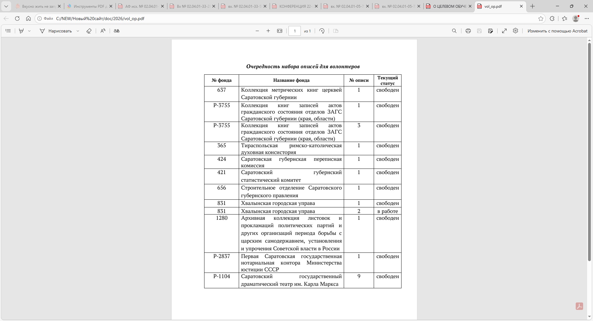В целях проведения запланированных мероприятий на 2026 год по усовершенствованию описи № 4 фонда № Р-3755 "Коллекция книг записей актов гражданского состояния отделов ЗАГС Саратовской губернии (края, области)" доступ к вышеуказанным делам ограничивается с 15.01.2026 по 30.04.2026 (приказ от 15.01.2026 № 3).